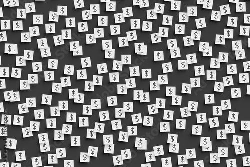Many white stickers on black board background with symbol of Bahamas dollar drawn on them. Flat view. 3d render, illustration