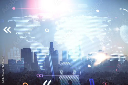 Map and data theme hologram on city view with skyscrapers background double exposure. International technology in business concept.