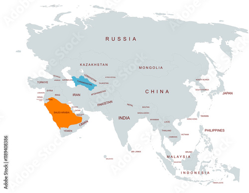 Map Highlighting Saudi Arabia and Turkmenistan Among Asian Countries