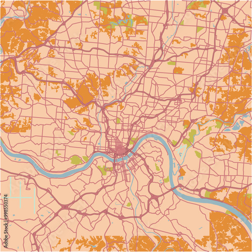 Map of Cincinnati in Ohio in a sandy theme. Contains layered vector with roads water, parks, etc.