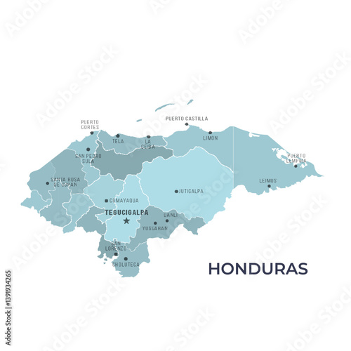 Map of HONDURAS with Regions Borders and Famous Cities