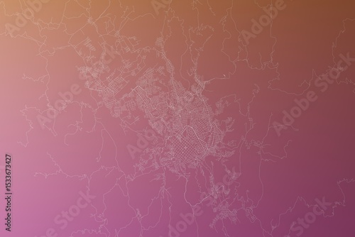 Map of the streets of Sucre (Bolivia) made with white lines on pinkish red gradient background. Top view. 3d render, illustration