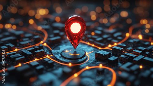 map with a location pin marking a destination, showing highlighted routes and pathways that represent journey, exploration, and the connection between places and people
