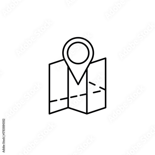 Map with a mark: A clean line icon showing a map with a location pin, representing navigation, travel routes, or destination finding in transport and journey themes.