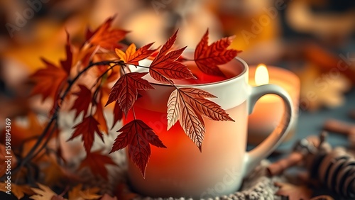 Maple leaf garland draped over a steaming spiced cider mug, illuminated by soft candlelight for cozy warmth.