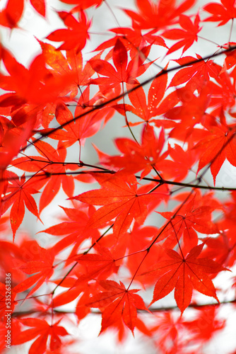 Maple leaves, autumn foliage patchwork, close-up view, red and orange tree leaves season is called Tampung in Korean, Hwaeomsa buddhist temple, South Korea