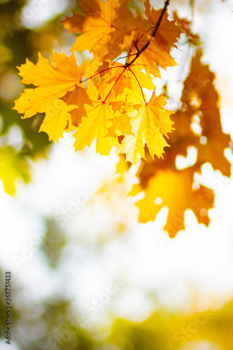 Maple leaves in autumn forest. Tree branch with autumn leaves. Yellowed maple leaves on a blurred background. Autumn nature background with bokeh. Very shallow focus