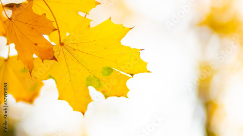 Maple leaves on a blurred background. Autumn background with yellow maple leaves