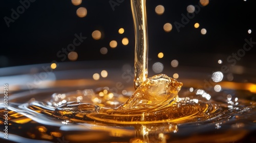 Maple syrup waterfall captured mid-pour, sticky threads connecting stream to surface, studio lighting for liquid highlights