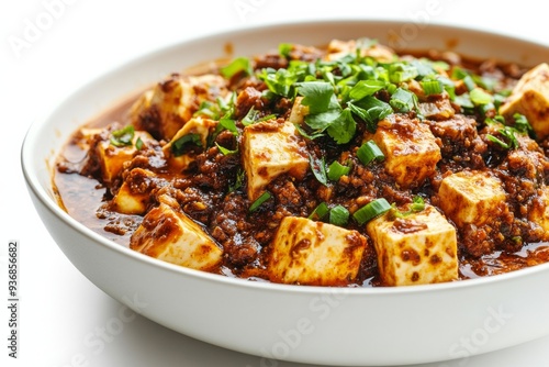 Mapo Tofu, A Sichuan dish made with tofu set in a spicy chili and bean paste sauce, typically containing minced meat. isolated on white background