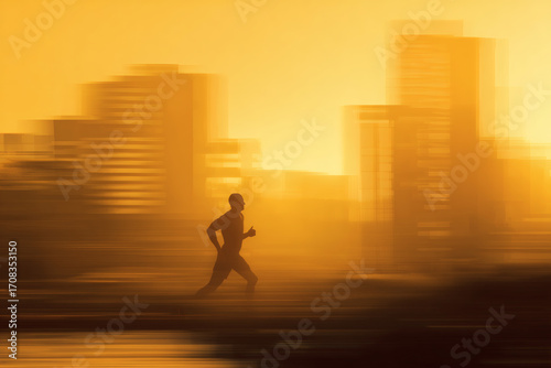 Marathon Runner Silhouette at Dawn with Urban Cityscape Background