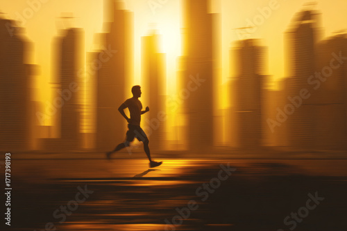 Marathon Runner Silhouette at Dawn with Urban Cityscape Background