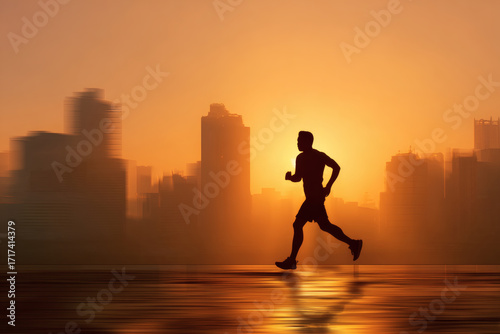 Marathon Runner Silhouette at Dawn with Urban Cityscape Background
