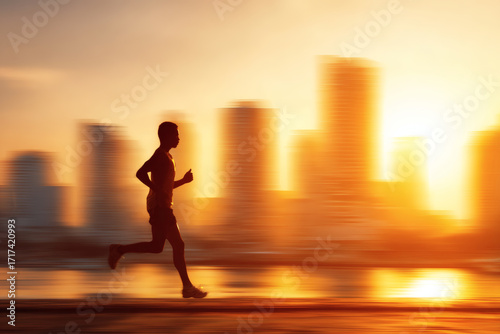 Marathon Runner Silhouette at Dawn with Urban Cityscape Background