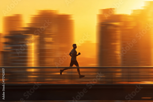 Marathon Runner Silhouette at Dawn with Urban Cityscape Background