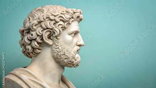 Marble bust of an ancient Greek philosopher in side profile, set against a soft teal background. The sculpture's curls and beard emphasize intricate craftsmanship. Copy space.