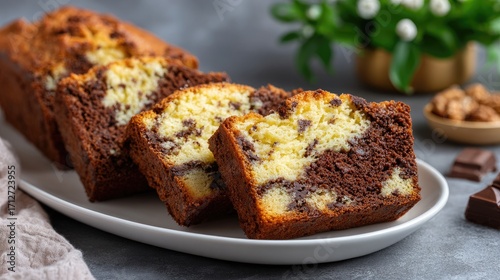 Marble cake slice displayed on a plate, surrounded by flowers on a kitchen table, captured in soft natural light