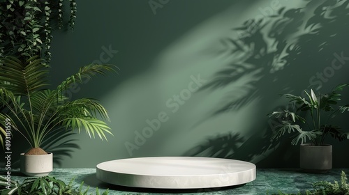 Marble product display podium with shadow nature leaves on white background,natural branches and green leaves with shadows,Mockup for eco beauty cosmetic advertising. Copy space, front view.