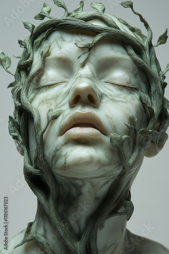 Marble-effect sculpture, battered cheek reveals intense green vines, gently placed on a calm gray gradient,