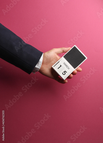 March 15 wooden block calendar in male hand on pink background