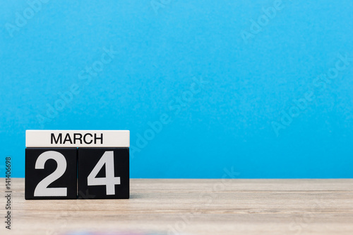 March 24th. Day 24 of month, calendar on table with blue background. Spring time, empty space for text