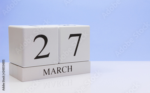 March 27st. Day 27 of month, daily calendar on white table with reflection, with light blue background. Spring time, empty space for text