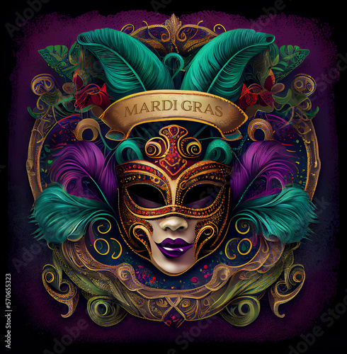 Mardi Gras mask, colorful poster, template, flyer. Art illustration. Women in carnival mask with feathers . Generative Ai.