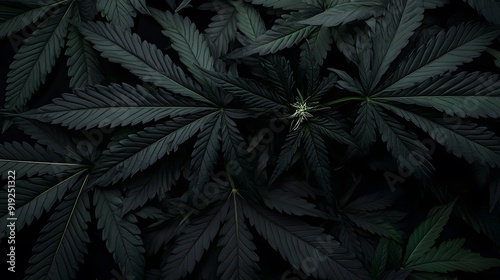 Marijuana leaves on a black background, close up top view on cannabis leaves and branches on black background for alternative medical and marketing design concept