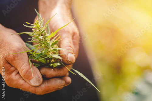 Marijuana sprout on farm cannabis grows in plantation greenhouse in hand