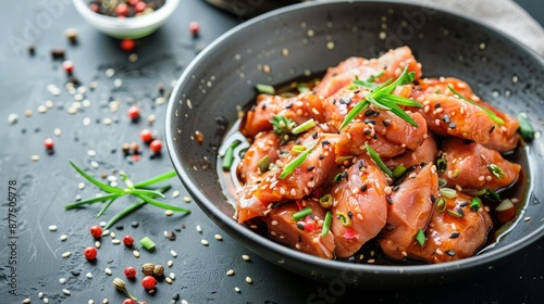 Marinated chicken with teriyaki sauce in a grey bowl.