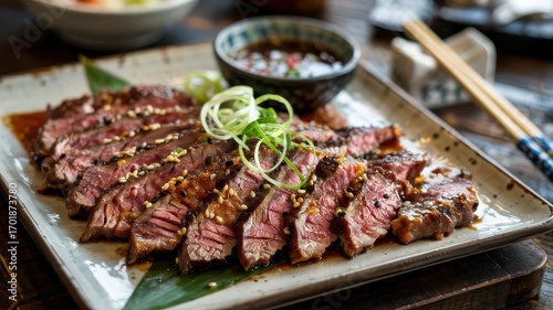 Marinated flank steak sliced and arranged on white serving plate with sesame seeds, green onion curls, and dipping sauce bowl with chopsticks on wooden table