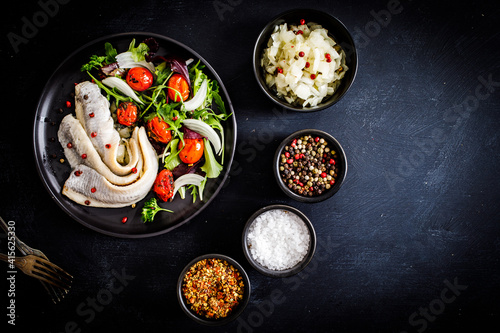 Marinated herrings with roast cherry tomatoes and fresh vegetable leaves on black table
