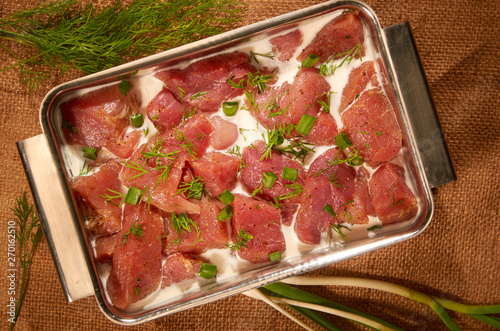 Marinated in milk and herbs, the meat in a steel pot on the cloth with fresh herbs