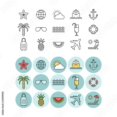 Marine flat vector icons set. Trip flat vector icons