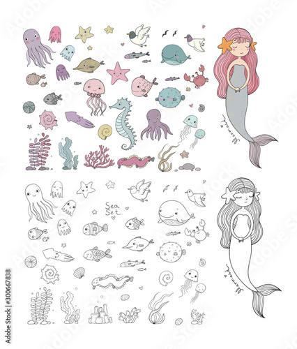 Marine illustrations set. Little cute cartoon mermaid