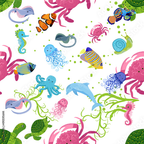 Marine life, fish, animals bright seamless pattern. sea travel, underwater diving animal tropical fish. Jellyfish, whale, shark, seahorse, clown fish, dolphin, turtle, emperor