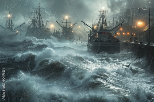 Maritime industry scene with ships, cargo, and dockworkers, highlighting ocean trade...