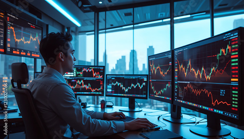 Market Analyst Monitoring Real-Time Trading Charts in a High-Tech Office