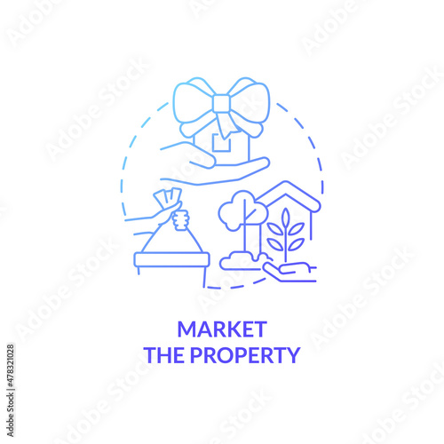 Market property blue gradient concept icon. Prepare realty for rent and sale abstract idea thin line illustration. Isolated outline drawing. Roboto-Medium, Myriad Pro-Bold fonts used