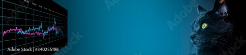 Market resistance and economic crisis concept. Black cat looking at graphs and charts with financial data analysis on classic blue colored background, banner.