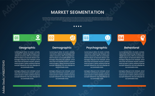 market segmentation infographic template with creative header table with footer dark background style with 4 point for slide presentation