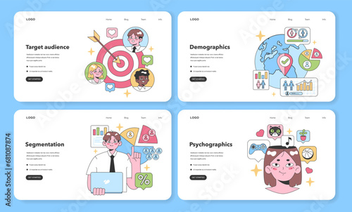 Marketing Analytics set. Engaging visuals on target audience reach, understanding demographics, effective market segmentation, and consumer psychographics analysis. Flat vector illustration.