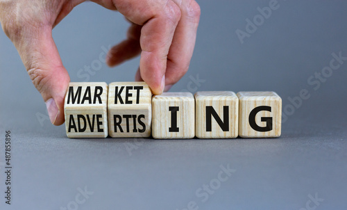 Marketing and advertising symbol. Businessman turns wooden cubes and changes the word Advertising to Marketing. Beautiful grey background, copy space. Business Marketing and advertising concept.