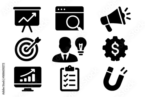 Marketing and analytics solid icon set. Business strategy symbols for growth, SEO, promotion, and targeting. Vector glyphs for presentation, finance, and customer attraction.