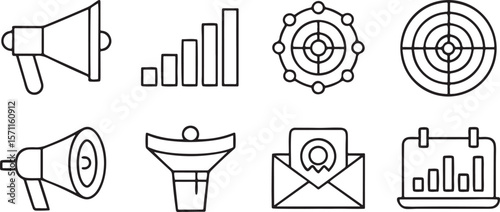 Marketing and promotion icon set, includes megaphone, target, email campaign, branding, analytics, sales funnel, black line minimal editable vector