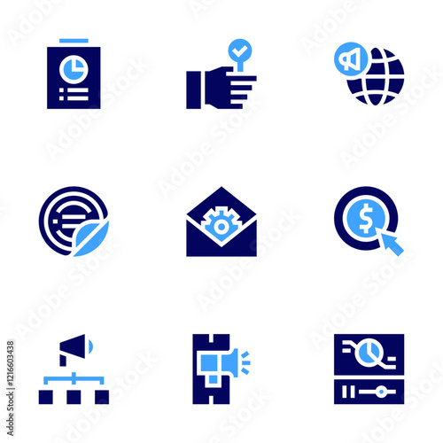 Marketing icon set. Bold style. Duotone colors. global marketing, envelope, pay per click, viral marketing, mobile marketing, video marketing, survey, checked, sticker