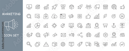 Marketing icon set. Marketing, advertisement, communication, content, seo, product, blog, promotion and more. Editable line icons. Vector illustration.