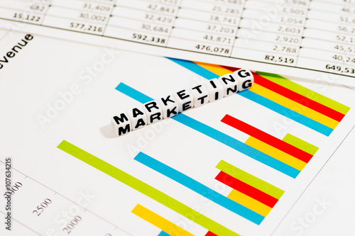 MARKETING on white cube, with colorful business charts
