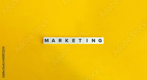 Marketing Word on Block Letter Tiles on Yellow Background. Minimal Aesthetics.