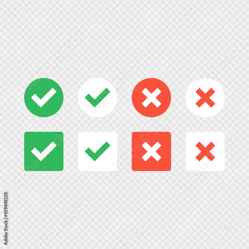 Marks icons set isolated on transparent background. Check marks pictograms. Vector confirm and reject design elements. Simple web buttons collection green check mark, red cross.